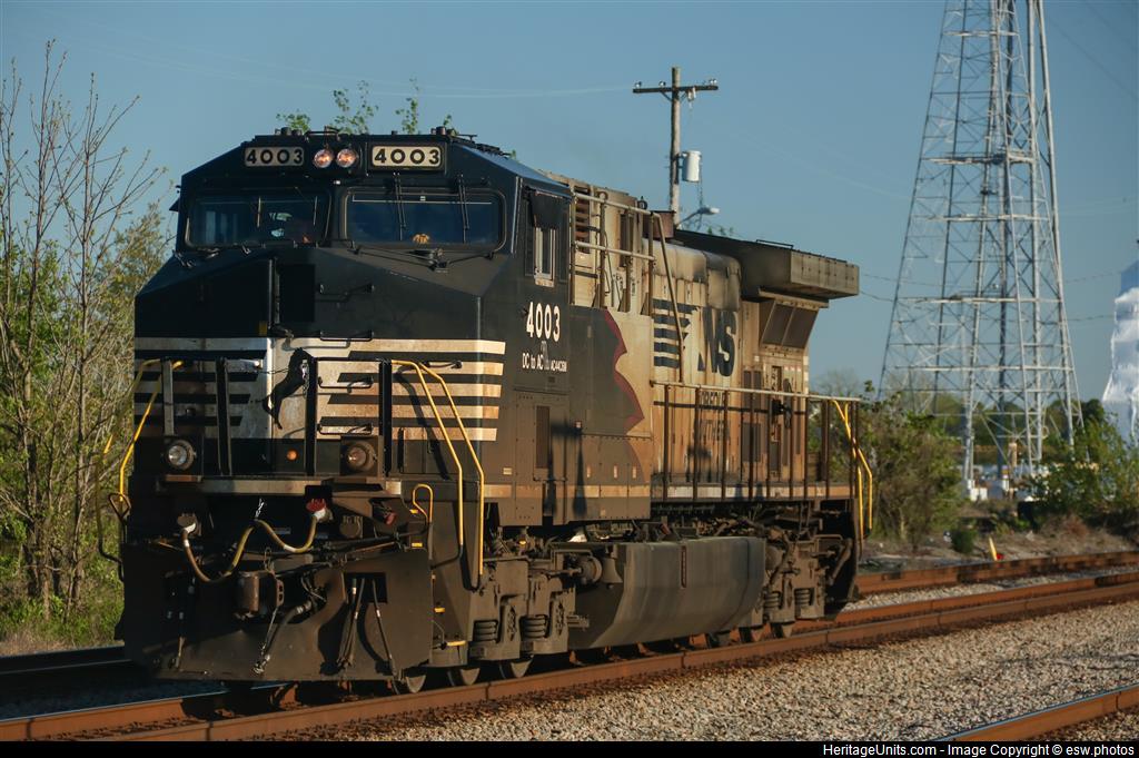 NS 4003 idles between the Harbor Park and Bridge 5 signals in Norfolk VA by the Amtrak Station. This unit was taken off NS 275 and was sent as lite power to Lambert's Point.
