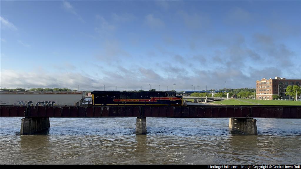 IAIS 519 as the rear DPU on CBBI-06 crossing over a swollen Des Moines River due to recent storms lately. IAIS 507 leading with a K5HLA horn.