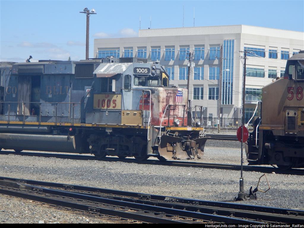 UP 1005 sitting at the Roseville works. UP 1068 sat here last time. however, UP 1005 looks a bit messed up..i know whats wrong with it, panels on the right side are open, exposing the engine, however the other side is alright. Whoever went in there last time didn’t shut the door properly as it was moving in the wind. Also note that the horn is pointing upwards. It might’ve hit a tree branch while doing local duties.