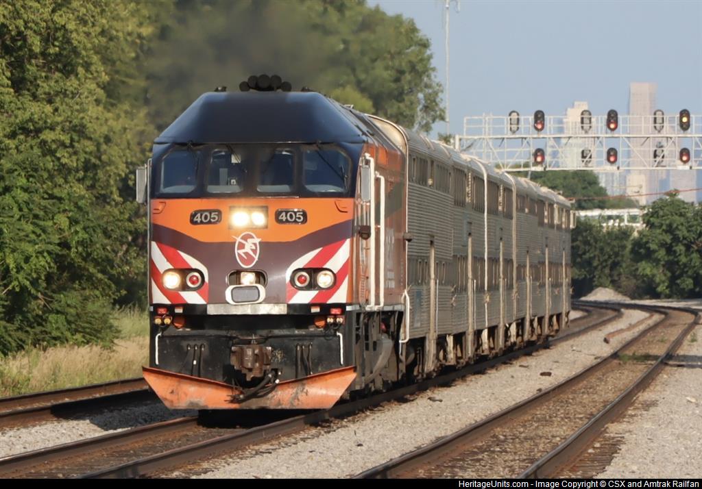 Metra 405 the Milwaukee Road Heritage Unit leads an outbound Metra train past Craigin on the Milwaukee West line bound for Big Timber Rd in Elgin