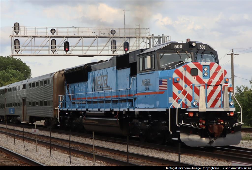 Metra 500 passes through Craigin pushing an inbound Metra train towards Chicago on the Milwaukee West Line