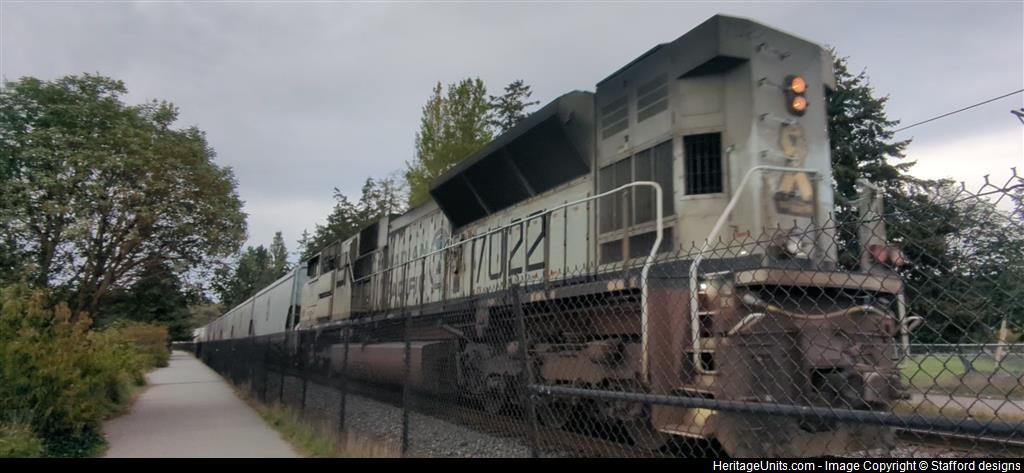 DPU of a 2x1 consist on UP GS-ETTA (KCS 4845, CP 8602 & CP 7022). First UP Grainer from Eastport for the Harvest season. Picture taken at 9/28/24 5:32 PM PT in Titlow Park Tacoma Washington