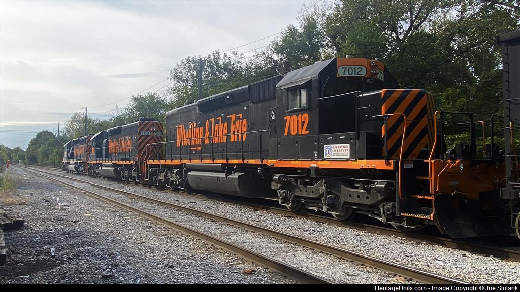 7009, 7021, and 7012 are facing west sitting in the siding at N Summit Street with a loaded stone train.