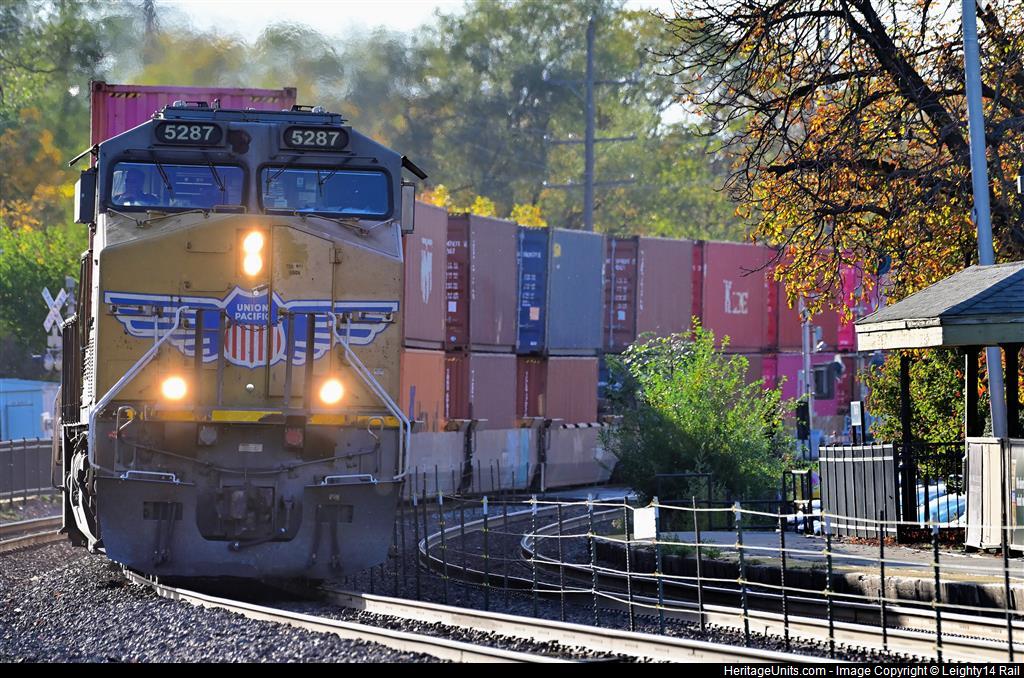 Solo lead on UP train ITAG4 negotiating a curve while passing the local Metra station on its way to Global 4 in Joliet, Illinois.