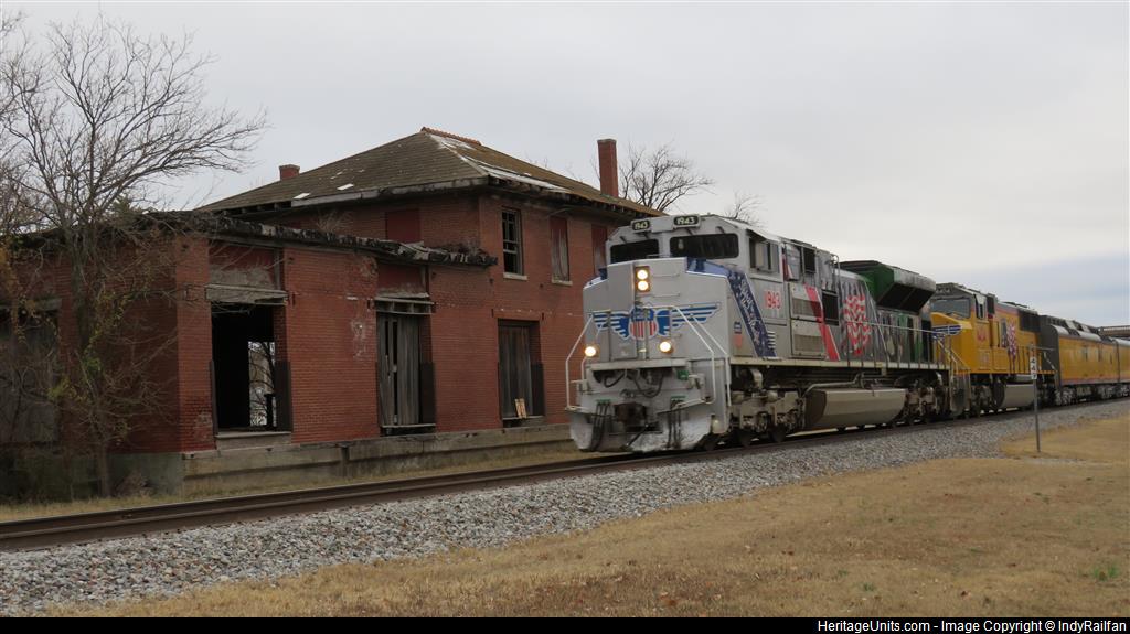 UP 1943 leading the PHOCB past the former Missouri Pacific freight house in Independence, Kansas
