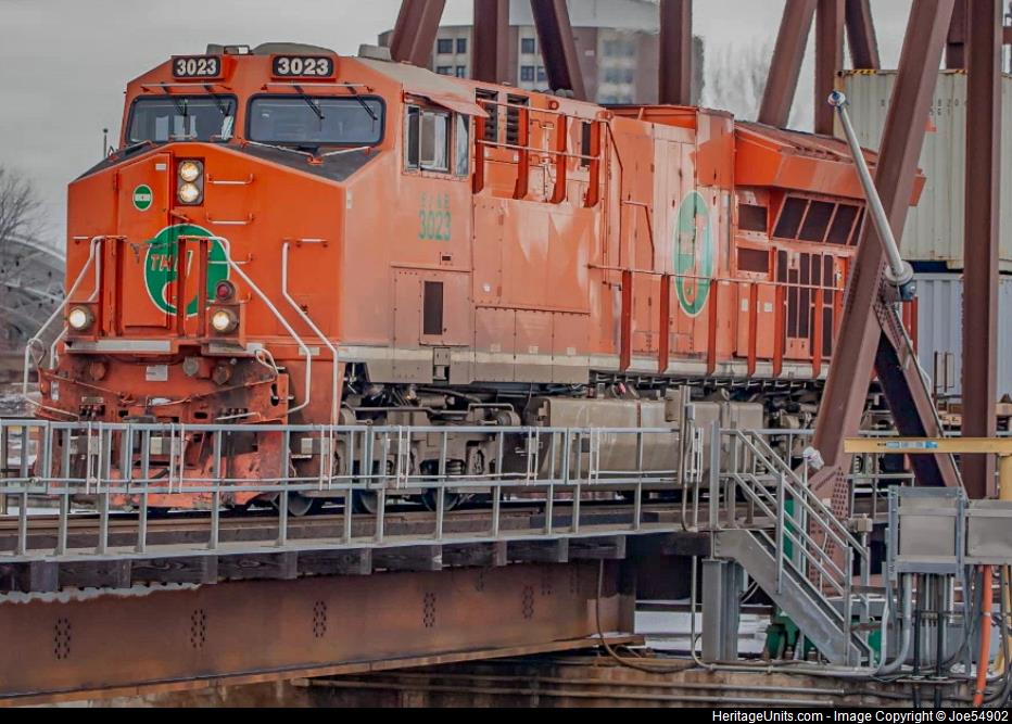 CN3023 leading run Q198 south over the Fox River at Oshkosh, WI
