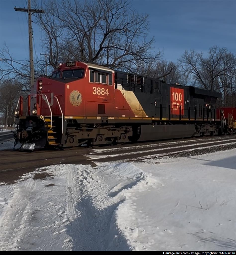 CN 100th anniversary locomotive leading with mid DPUWestbound 954AM