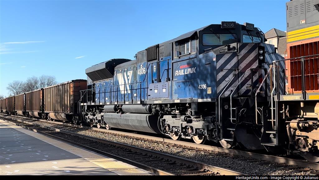 MRL 4306 trails second on a BNSF coal train through Downers Grove.