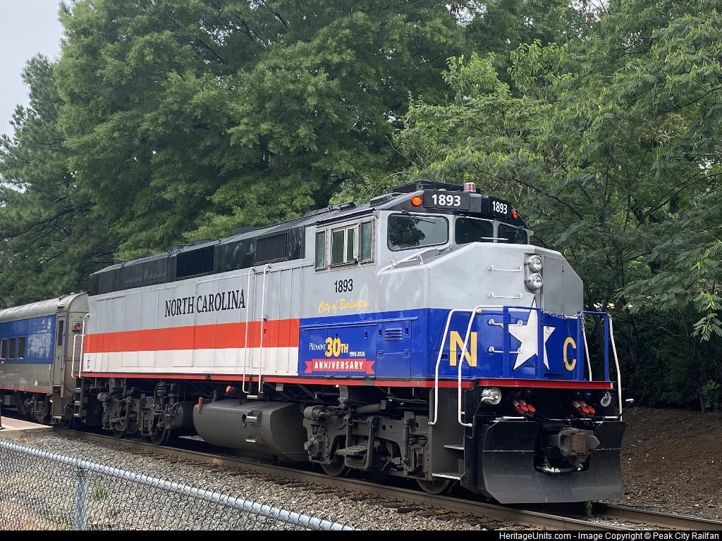 RNCX 1893 trails on the Amtrak 73 Piedmont on 7/11/25 as it makes it station stop in Cary, NC.