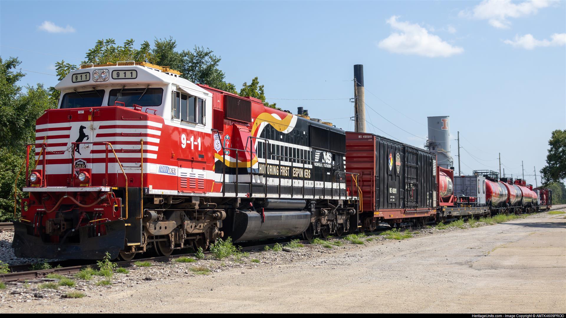 NS911 Sits Idle With the Safety Train Consist In The VIP Track With The University of Illinois Power Plant Behind.