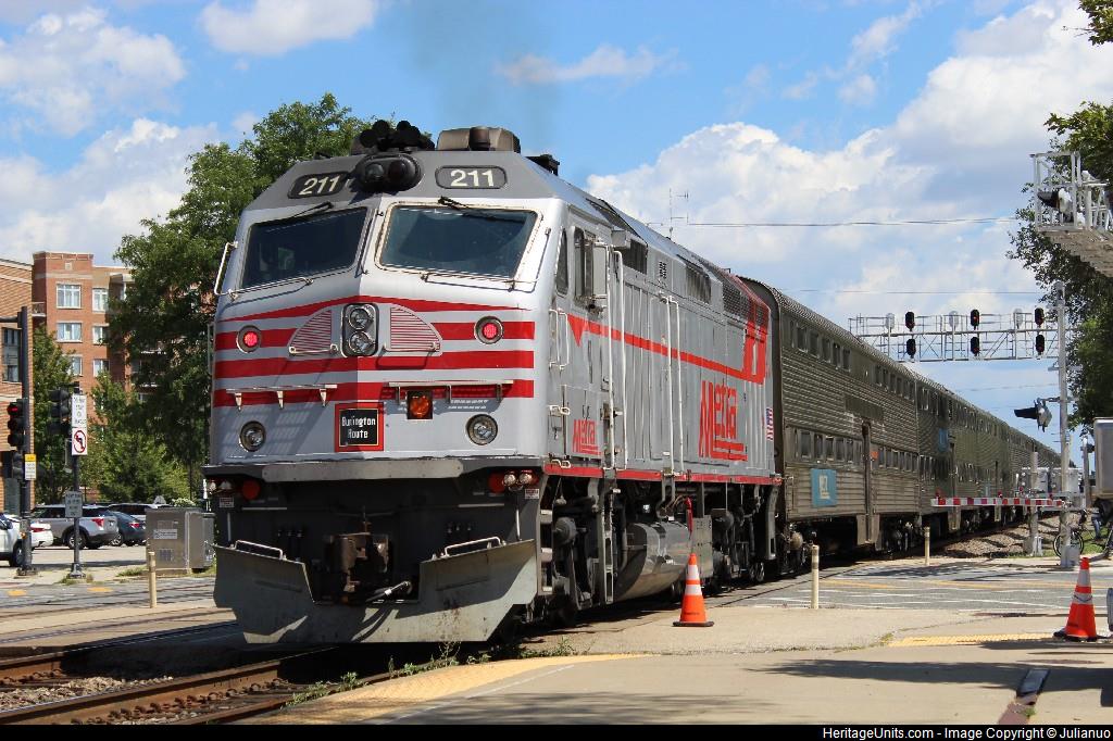 METX 211 pushing an inbound train towards Chicago.
