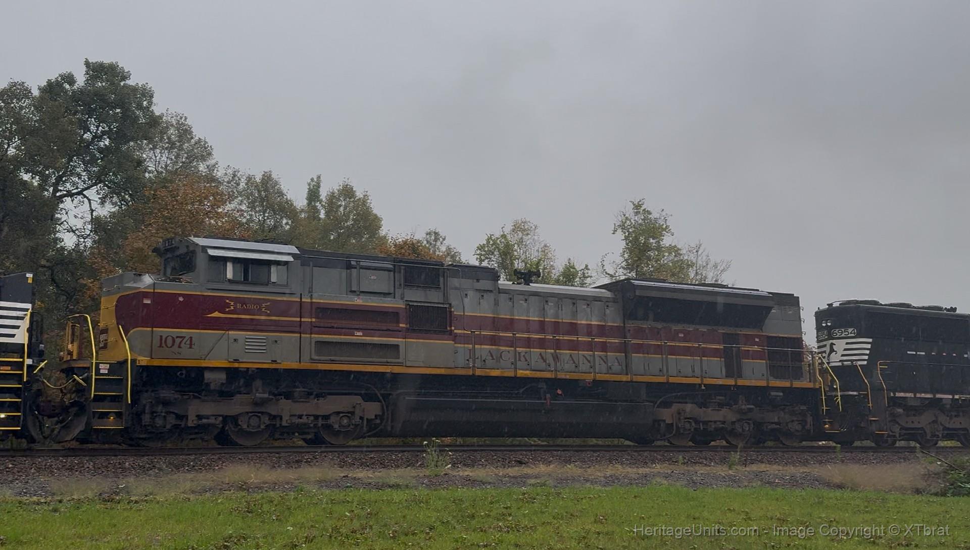 1074 trails on an intermodal train during heavy rain