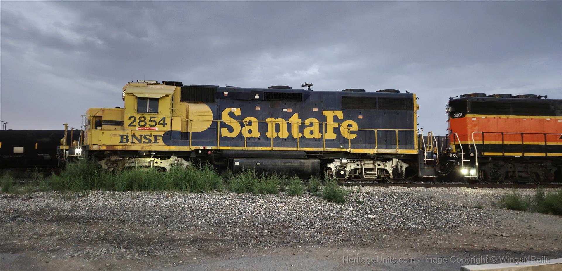 BNSF 2854 sits coupled to BNSF 3005, on a local, tied down for the night.