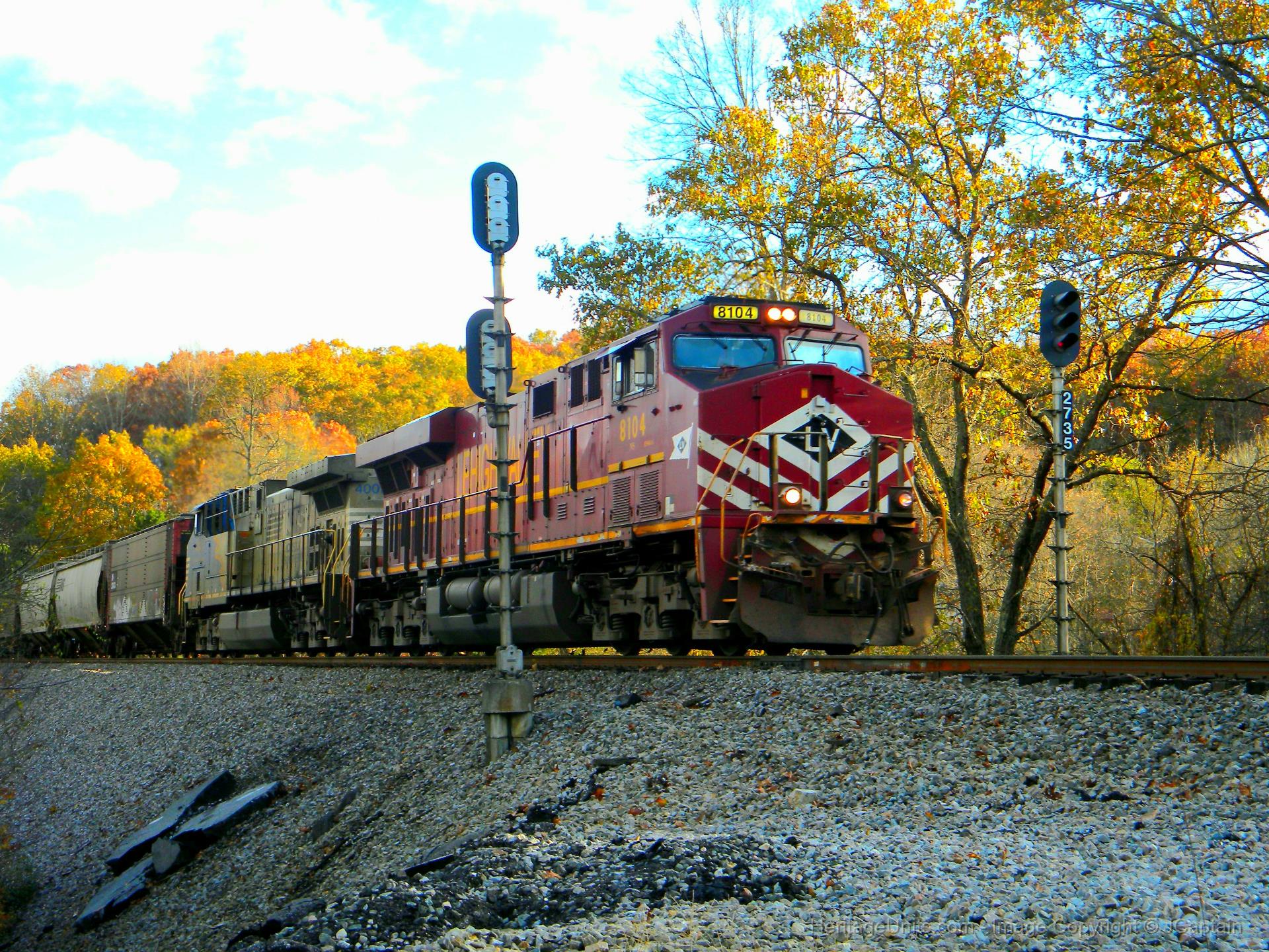 8104 and 4001 split the intermediates at Ellett (V273.5), leading grainer 40N eastbound towards Roanoke, VA on the old Virginian mainline