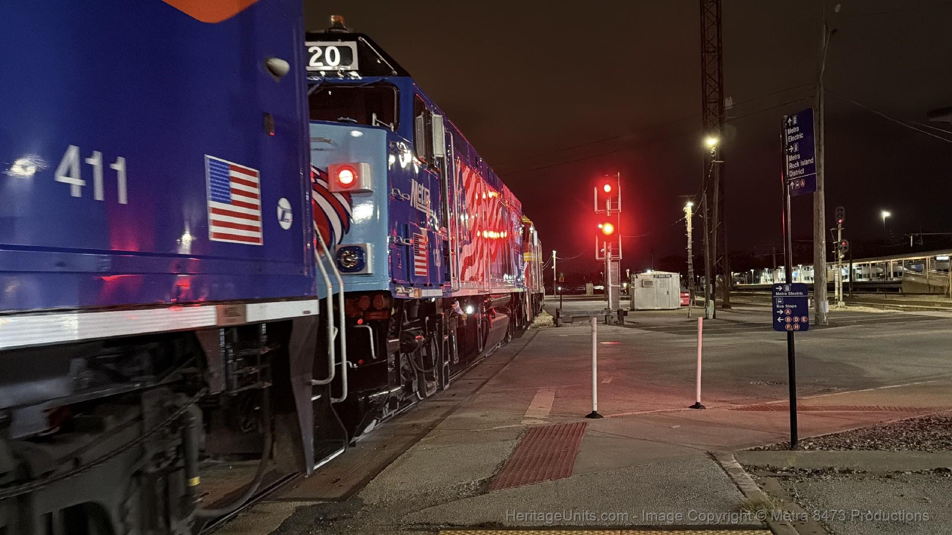 METX411, METX120, and METX425 triple header pull a Metra Train out of Blue Island Coach Yard and then shove back into Blue Island Coach Yard.