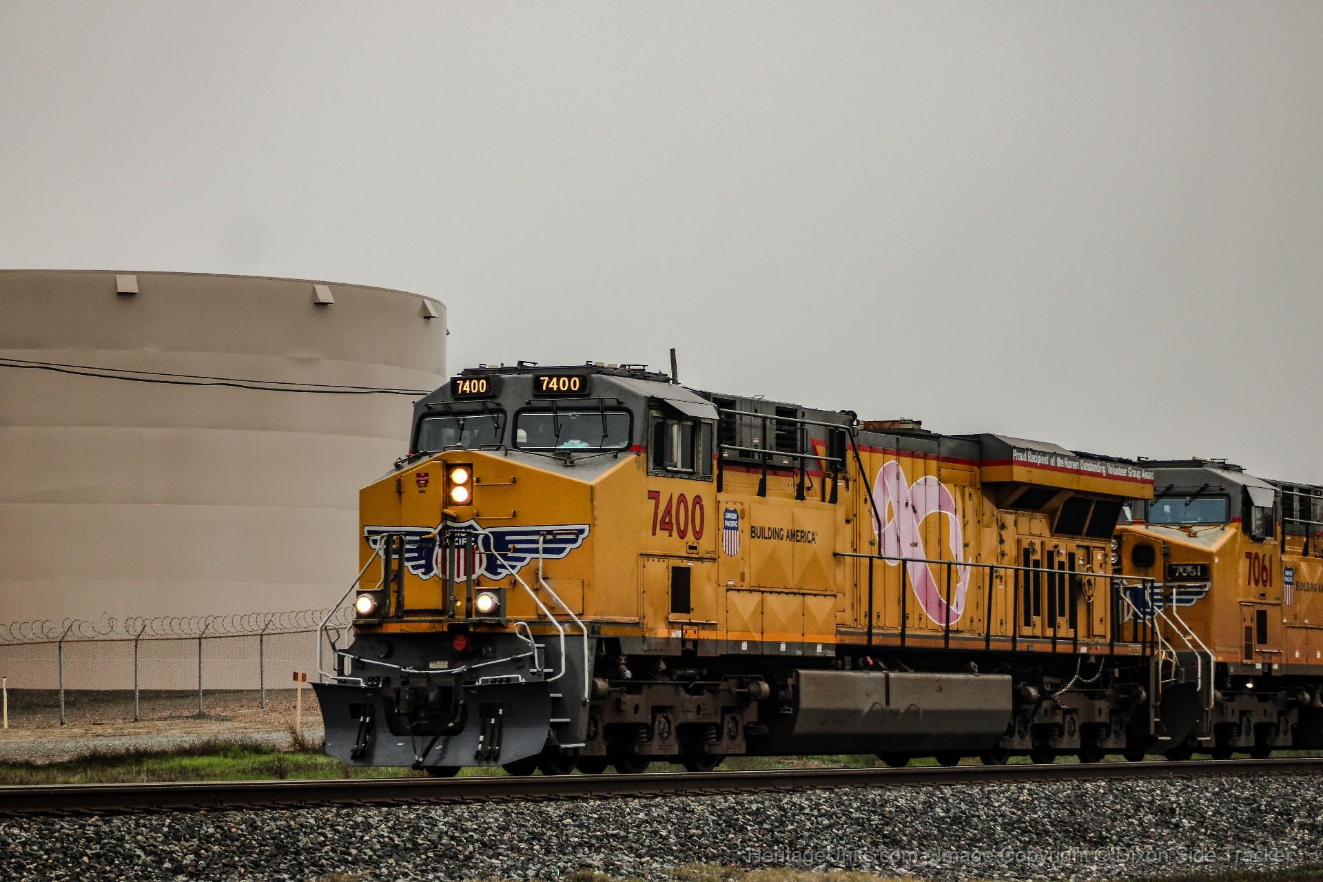UP 7400 leads a short and overpowered MSPRV through Rocklin California as it completes its journey over donner pass from Sparks.