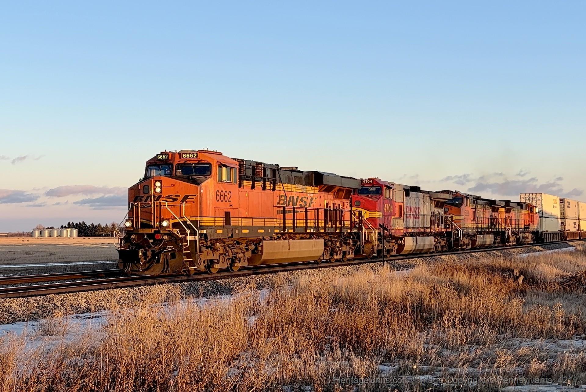 BNSF Warbonnet #4704 trailing second from the leader on a westbound intermodal racing through Des Lacs, ND on the Glasgow subdivision at sunset.