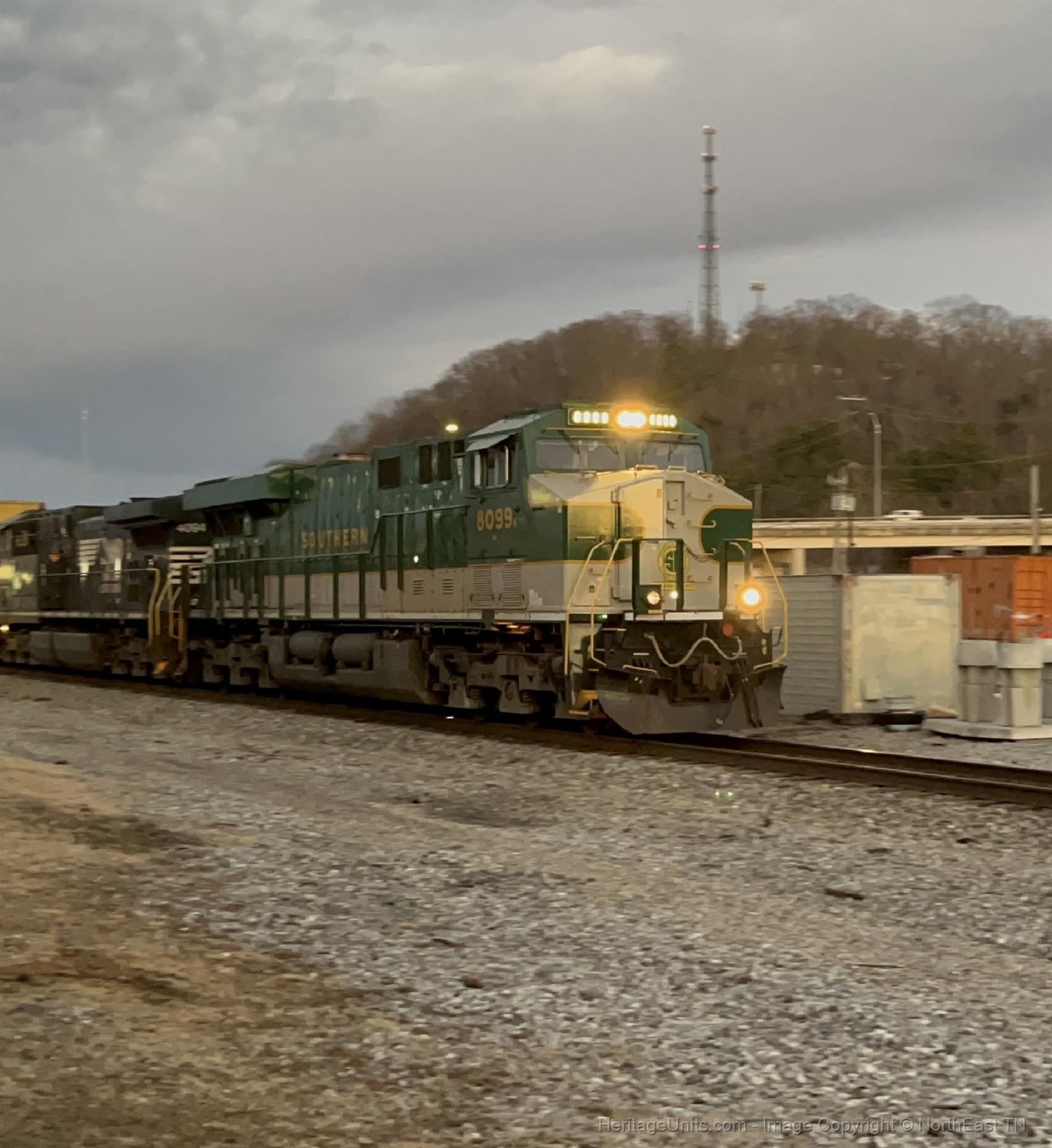 Photo of NS 8099 leading M5T in downtown Johnson City, TN. Taken in the evening light.