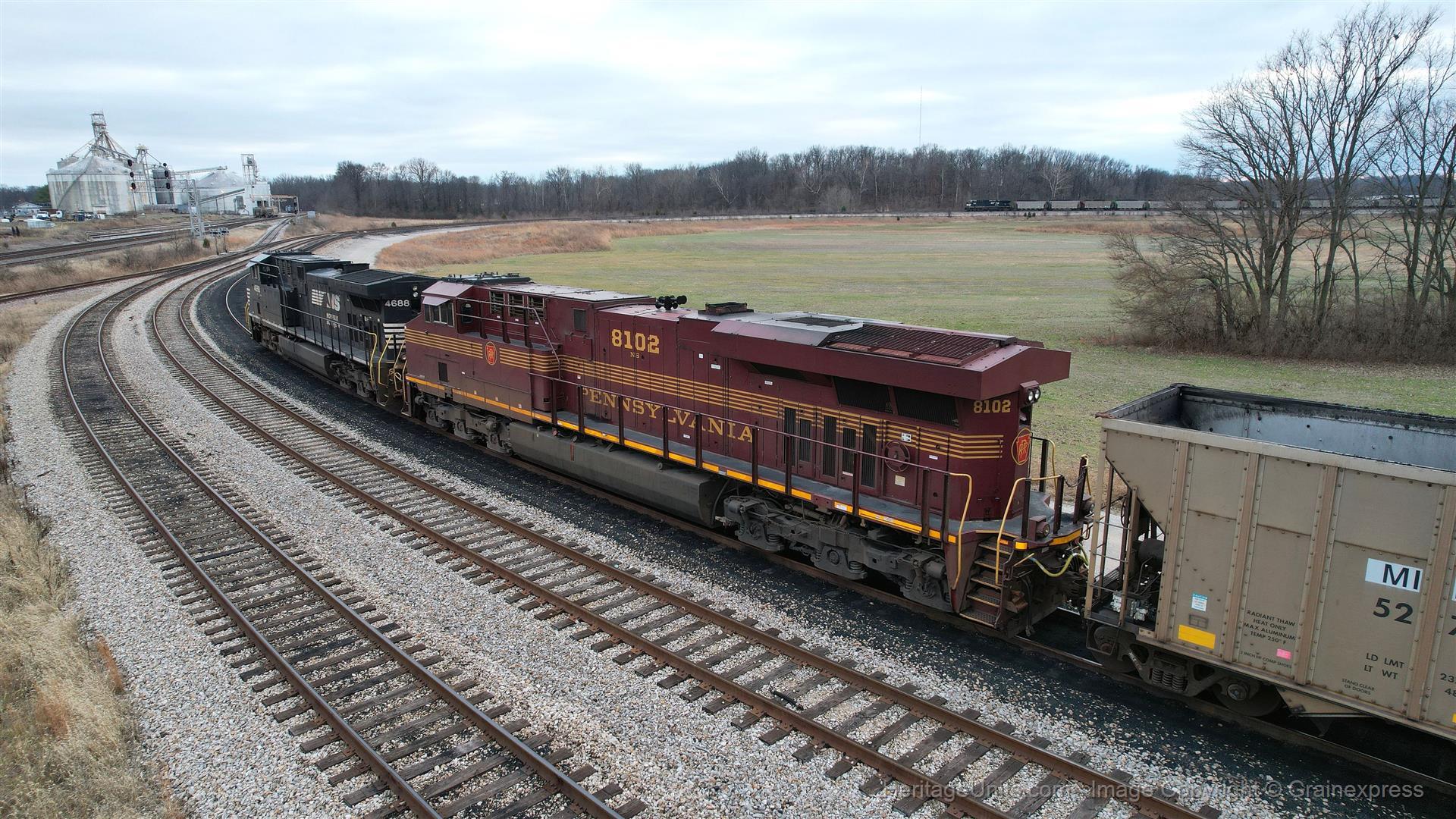 NS 8102 is loading in the Alliance Coal Loop at Princeton, IN. You can see the head end with loaded cars on the other side of the loop. The CSX CE&D main is on the left side and the NS main is next to the solo NS unit on the other side.