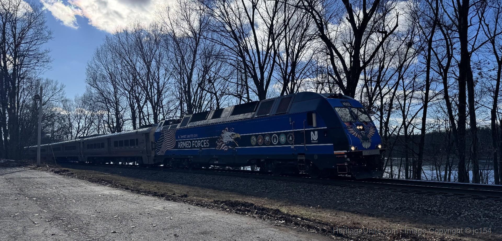 NJT 4502 leads NJT 1613 past the Woodcliff Lake Reservoir on the WCL/Park Ridge border.