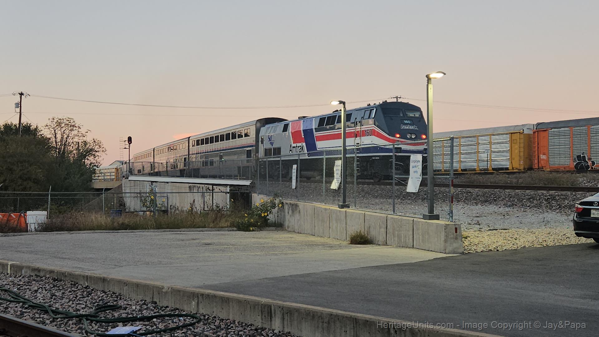 on the heartland flyer while a bnsf train comes by.