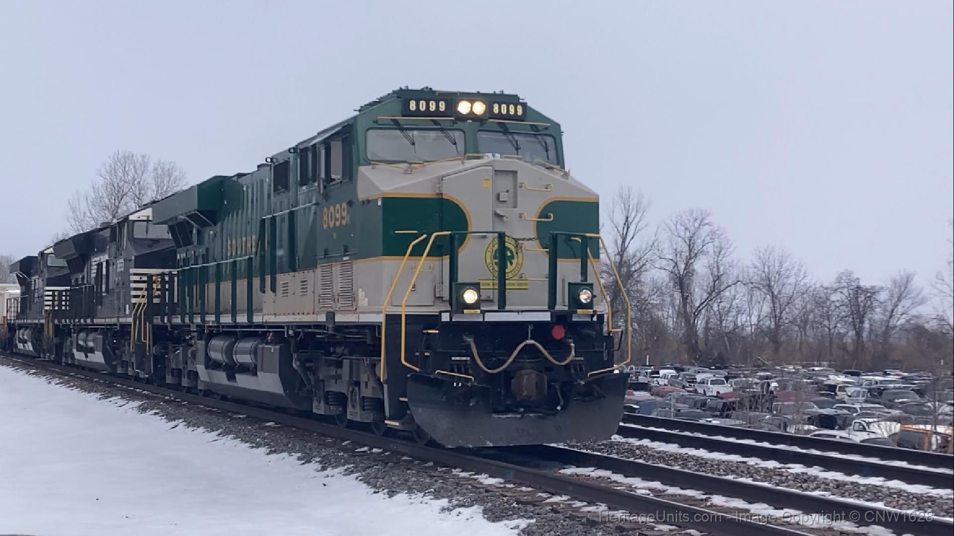NS 8099 leads NS 3653 and NS 7573 elephant style on NS 259 past the Junkyard and under Route 291.