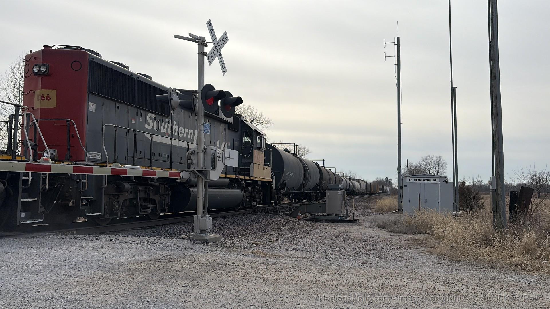 UP 1066 trailing on MDMDM leaves the siding at Cambridge after letting UP 1996 to pass