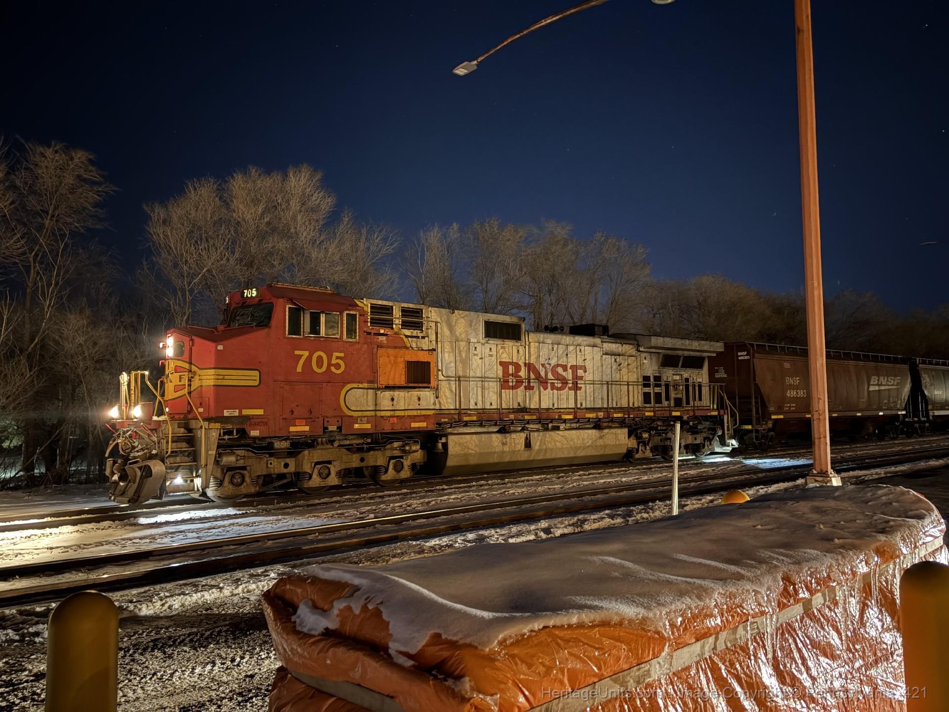 BNSF 705 sits by the Minot Amtrak station, awaiting clearance to lead its grain train west.