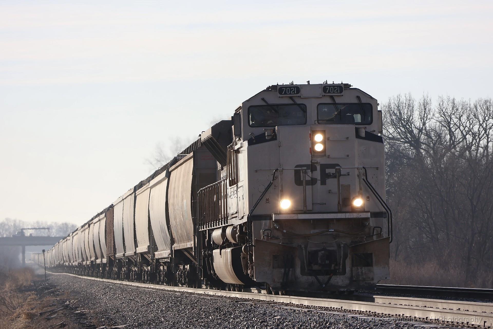 CP 7021 Leads CPKC 331 westbound grain train west of Columbus, WI at 0749