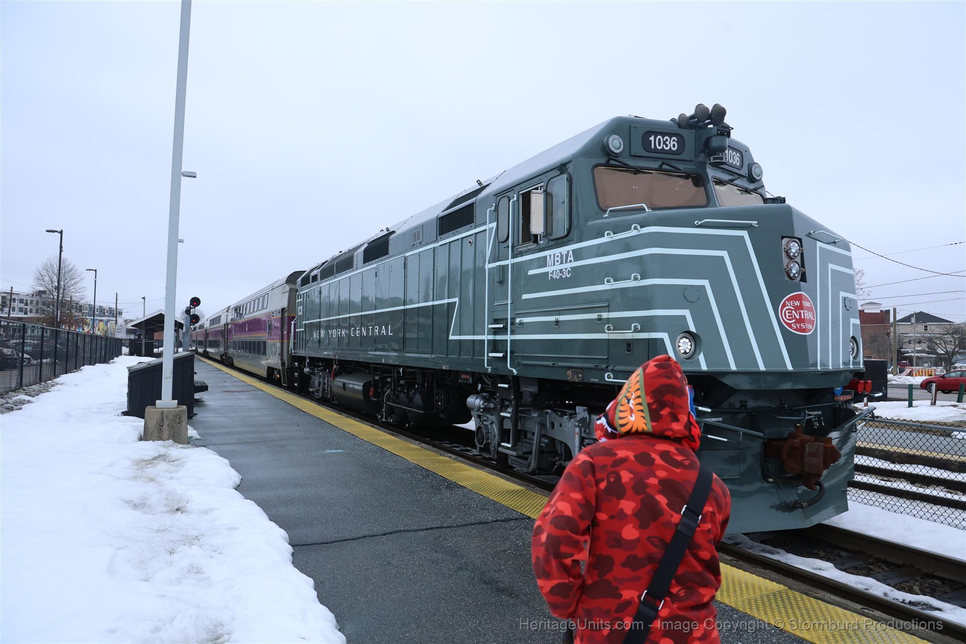 Heritage Unit Meet! P545 WB (MBTX 1036/1859) meets P550 EB (MBTX 1851/1071) at Framingham, with Average MBTA Railfan scoping them for new pin designs.